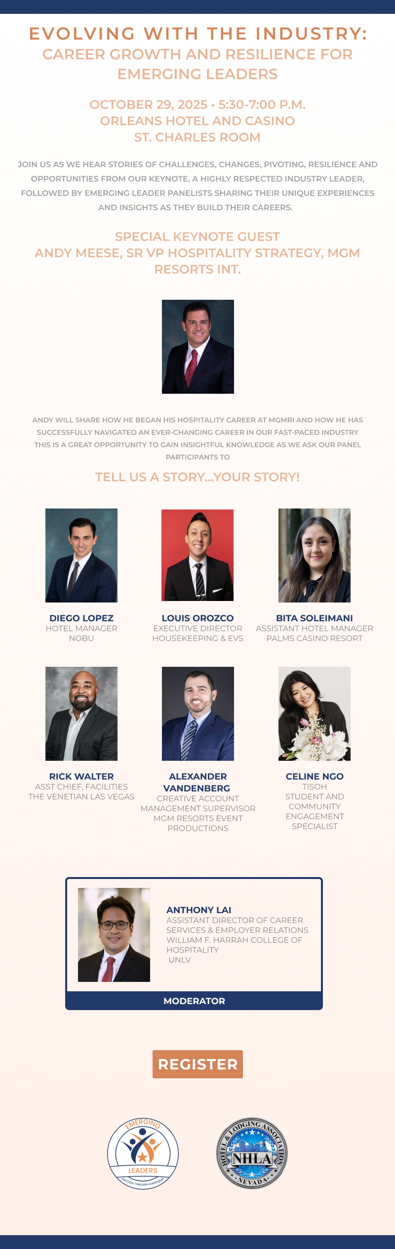 All NHLA members are invited to attend this insightful event featuring Andy Meese, SVP Hospitality Strategy, MGMRI, as our special guest speaker followed by a panel of rising stars in the industry outlining their journey including challenges, successes and tips for growth. Don't miss it! ![]() |